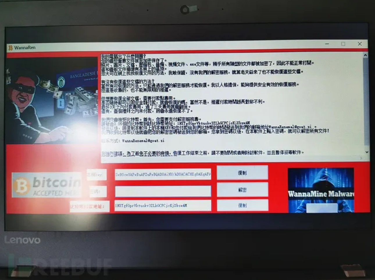 其中,该勒索软件的赎金为0.05个比特币。用户中招后,会弹出一个窗口,发送勒索内容,指导用户缴纳赎金。从中可以看出的是勒索内容语言为繁体,邮箱地址显示为WannaRenemal@goat.si。