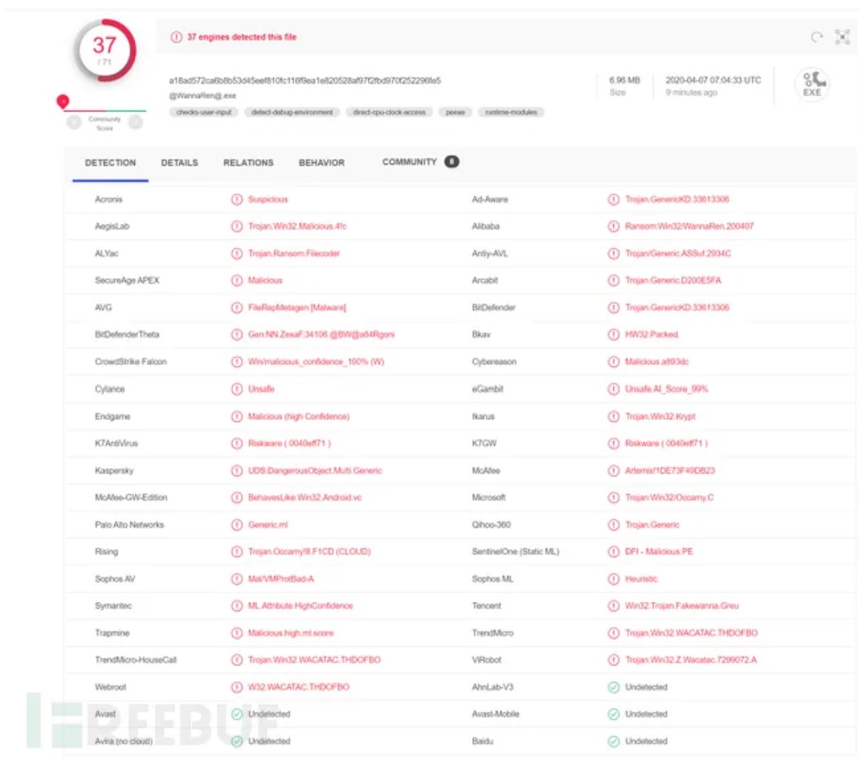截至发文,检测网友上传的病毒样本可以看到,目前已有37个主流杀毒软件已经可以检测到WannaRen病毒,比如360、腾讯等厂商。