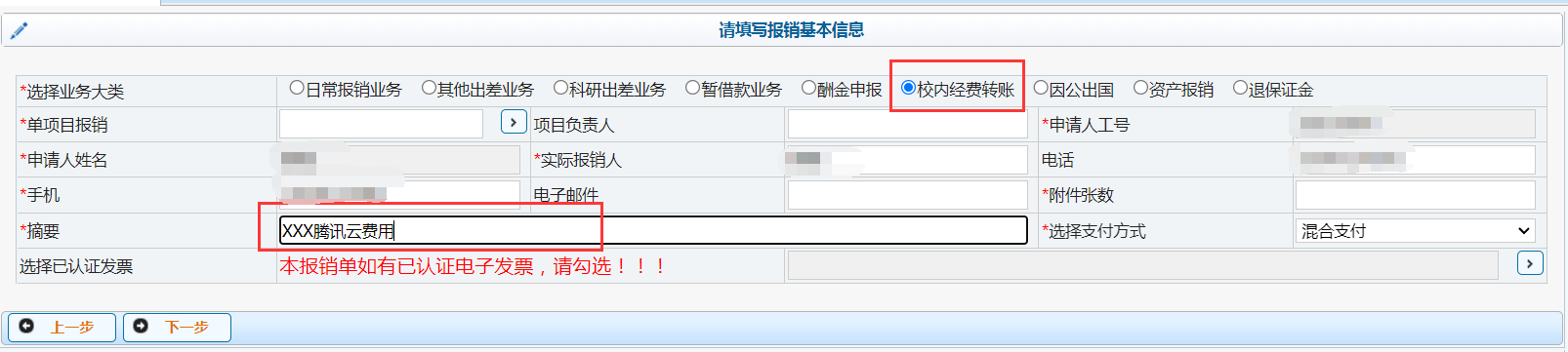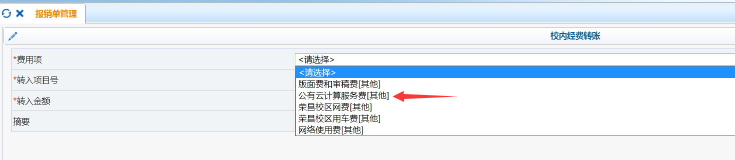 6. 云服务使用费采用后付费机制,每月按实际使用情况形成账单。信息化建设办公室通过“数智西大”(钉钉)向服务计费账户的负责人发送月度账单与明细,负责人可通过校内转账完成支付:登录财务平台,申请报销单,选择“校内经费转账”,并在摘要中注明“负责人姓名+腾讯云费用”, 在下一页面选择“公有云计算服务费”,投递报销,将经费转帐到学校云服务专用帐户。