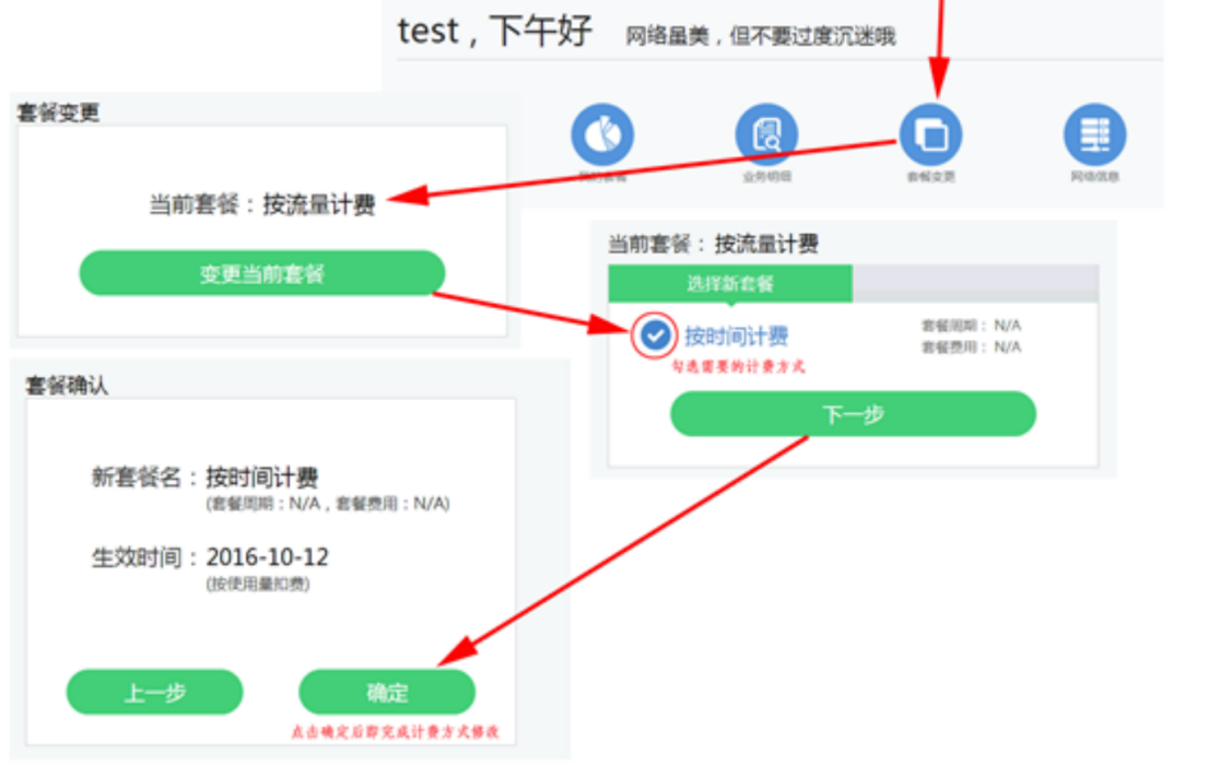 4、输入用户名和密码,登录到账号自服务中心、点击“套餐变更”来选择新的计费方式