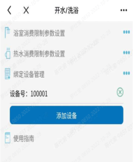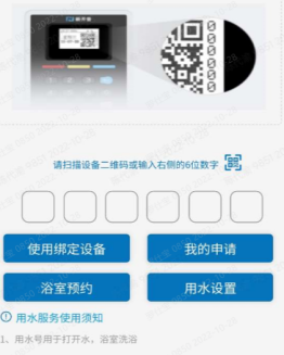点击用水服务,扫描二维码或输入6位设备号,即水控上面的字号。如果是长期固定寝室可以点击“使用绑定设备”进行设备号绑定,后续使用不再需要输入设备号,详见图2、图3。用户可通过“用水设置” 改消费限时和消费限额。