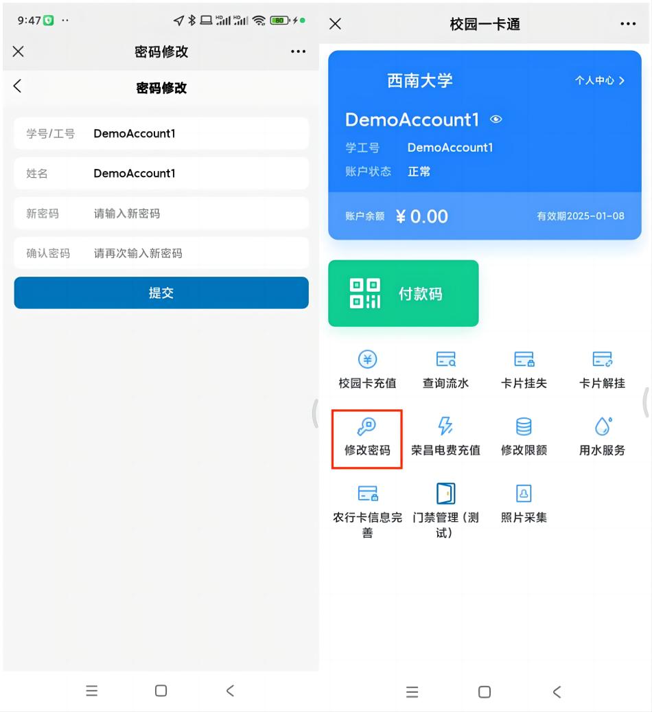 3.首次绑定新版校园卡(虚拟卡)修改密码
