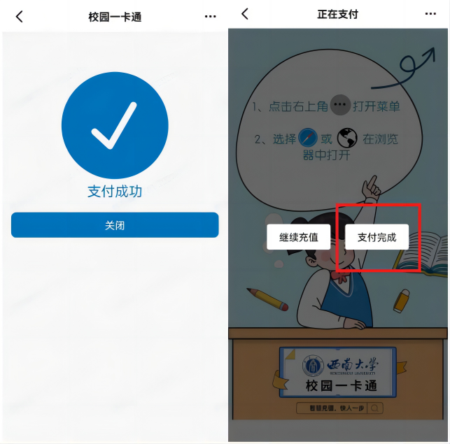 点击“完成”后,弹出返回提示,操作手机返回“一卡通”进程,点击“支付完成”,关闭随后出现支付成功页面,即完成充值操作。