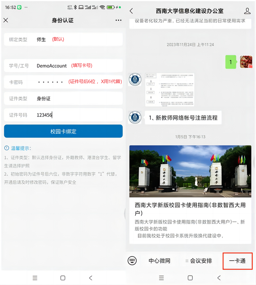 进入公众号,点击下方“一卡通”按钮,进入绑定界面,输入对应信息进行绑定,如下图: