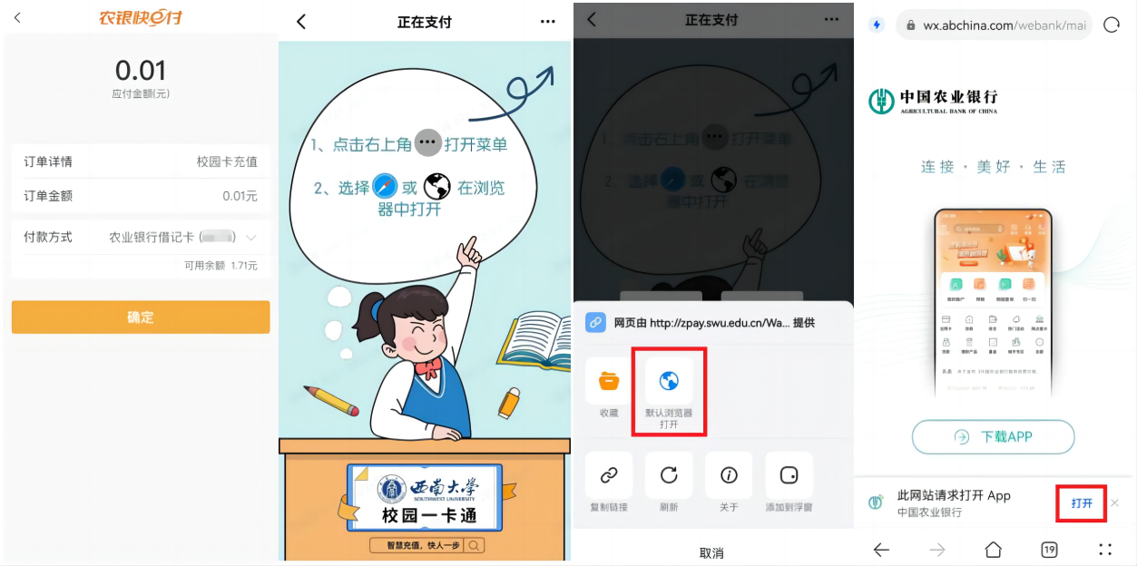 “校园卡充值”选择输入金额后,进入跳转提示页,点击该页面右上角“…”,选择“默认浏览器打开”,进入默认浏览器中的呼起掌银跳转页,根据页面请求提醒点击“打开”,呼起“中国农业银行”APP,进入充值页面。(需要注意不同型号手机默认浏览器中“打开”按钮位置不同,部分机型“打开”提醒框出现时间较短,需要及时点击“打开”,如遇无“打开”按钮的情况,需更换默认浏览器)