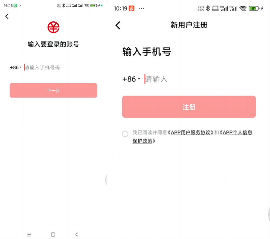 1.2 打开“数字人民币”APP,点击新用户注册按钮,阅读注意条款后,点击继续注册,根据提示信息输入注册的手机号码和验证码,完整验证: