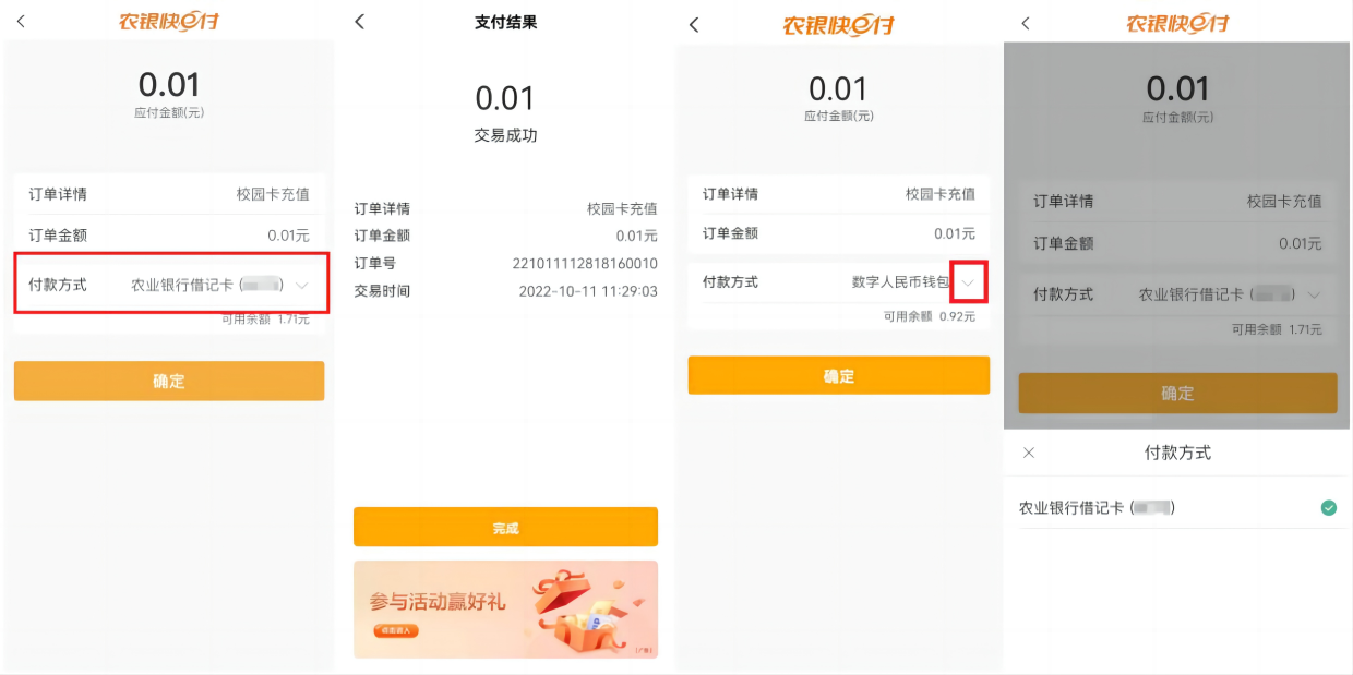 进入充值页面后,选择“付款方式”为“农业银行借记卡”,点击“确定”,输入“中国农业银行”账户密码(请勿输入虚拟校园卡密码),完成充值操作。(如“付款方式”显示为“数字人民币”,需点击右侧向下箭头,切换付款方式为“农业银行借记卡”)