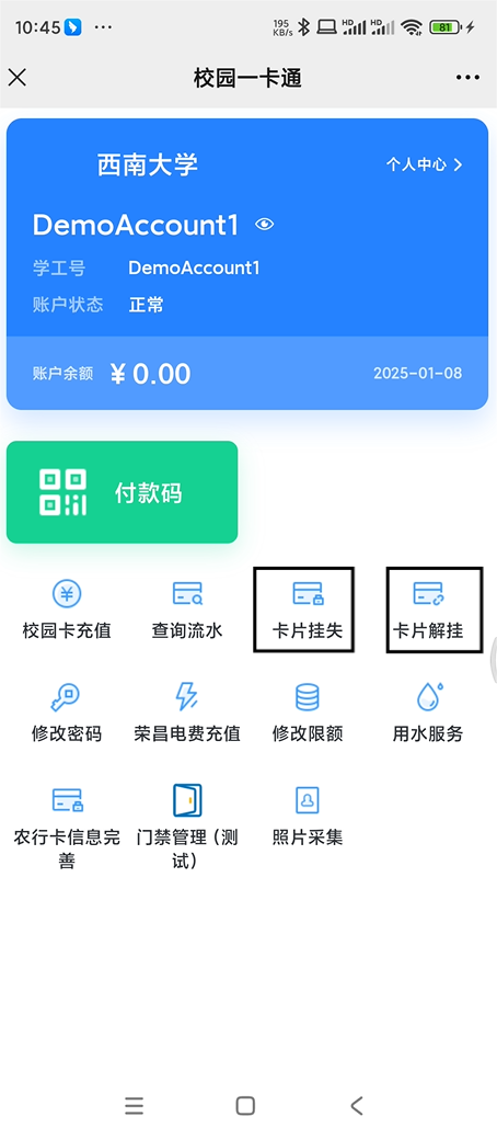 新版校园卡(实体卡)挂失与解挂: