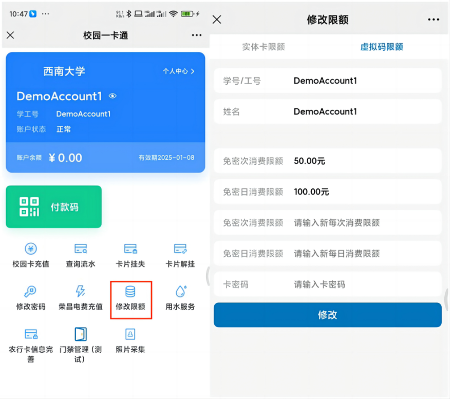 五、修改新版校园卡(含实体卡与虚拟卡)消费限额