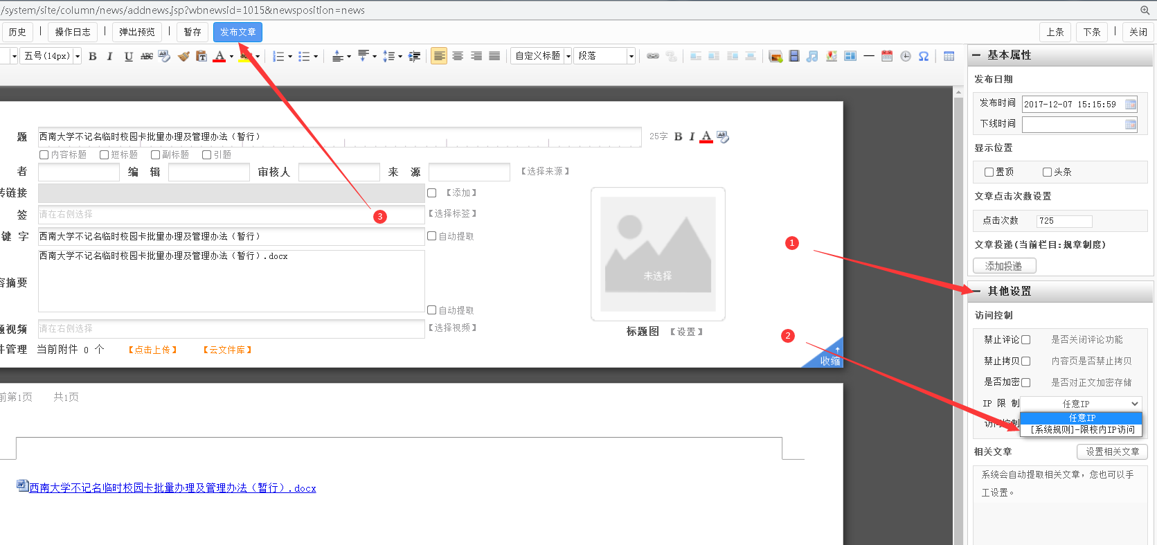 2.点击“其他设置”,选择“限校内IP访问”,点击“发布文章”,即设置成功。