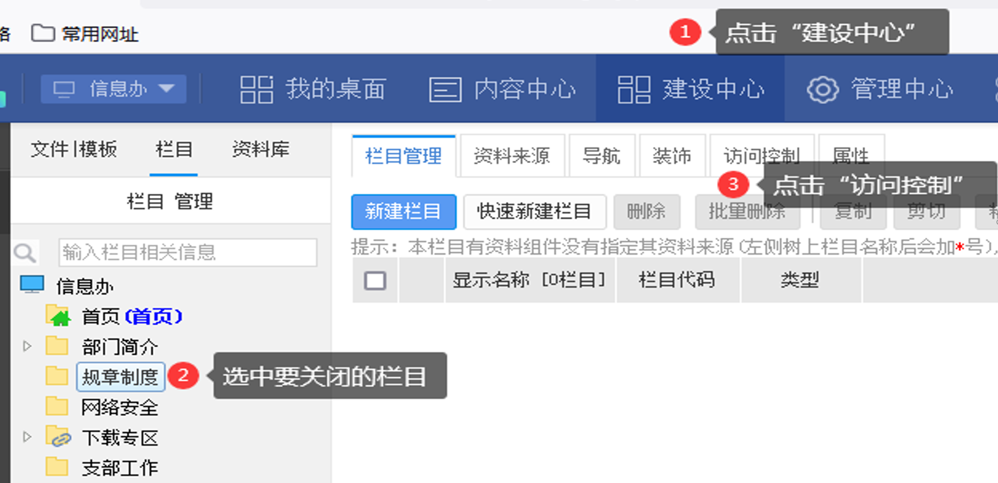 登录系统后台,1.点击“建设中心”,2.选中要关闭外网访问的栏目,3.点击“访问控制”。
