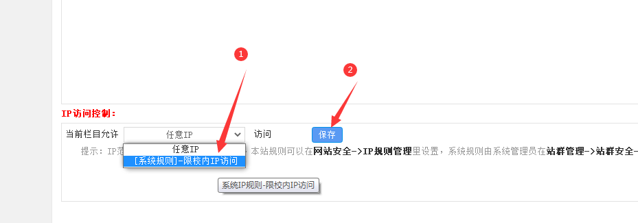 通过页面 底部的“IP访问控制”功能区,选择“限校内IP访问”,保存之后即可实现栏目关闭外网直接访问。