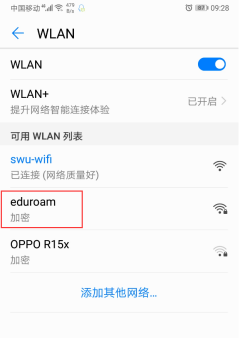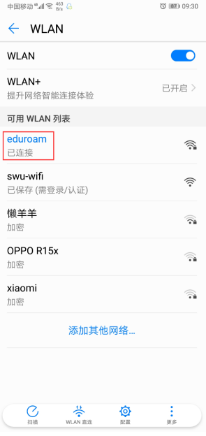 2、进入无线WLAN设置,搜寻“eduroam”信号并点击选择;