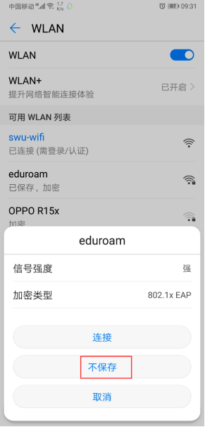 注:若连接不成功,可删除eduroam重试一次,方法如下:点击eduroam图标,选择【不保存】或【删除网络】。