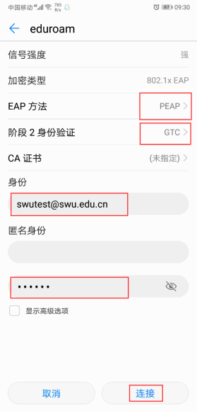 3、选择“eduroam”后,会自动弹出登录页面,EAP方法选择“PEAP”,阶段2身份验证选择“GTC”,在身份和密码处输入eduroam帐号和密码(PA视讯官网师生出访时,eduroam账号为校园网账号@swu.edu.cn,密码为校园网账号的密码;访客来访时,其eduroam账号为其原机构账号@原机构所在域名,密码为其原机构账号的密码),点击“连接”,如下图: