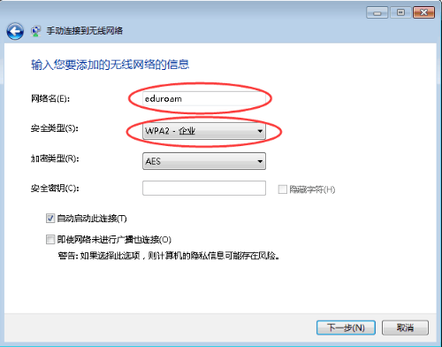 4. 如图,填写你想要连接的网络名eduroam,安全类型选择“WPA2-企业”,然后下一步,如下图所示: