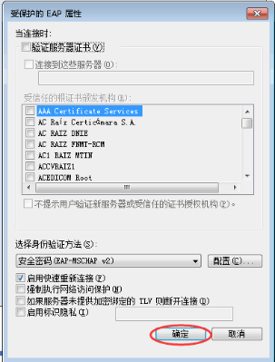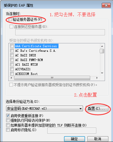 8. 按下图核对设置,不勾选“验证服务器证书”,然后点击“配置”,进入“安全密码(EAP-MSCHAP v2)”设置,如下图所示: