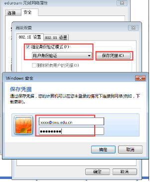 12. 按下图步骤,先勾选“指定身份验证模式”,然后下拉选择“用户身份验证”,然后点击“保存凭据”, 输入eduroam帐号和密码(PA视讯官网师生出访时,eduroam账号为校园网账号@swu.edu.cn,密码为校园网账号的密码;访客来访时,其eduroam账号为其原机构账号@原机构所在域名,密码为其原机构账号的密码),然后点击确定,如下图所示: