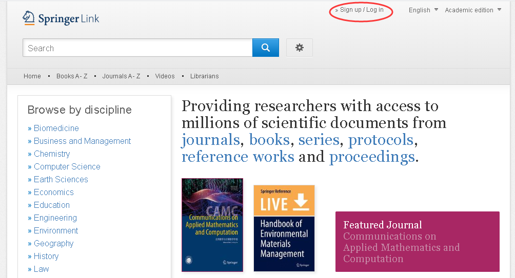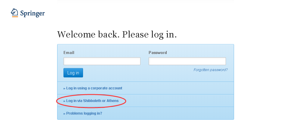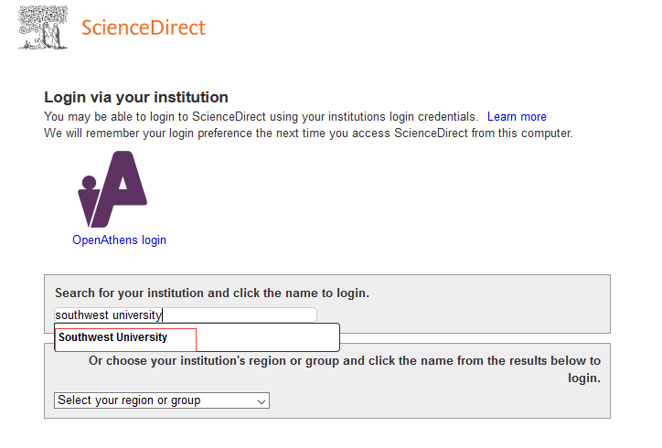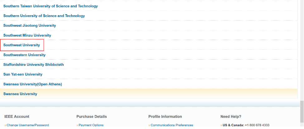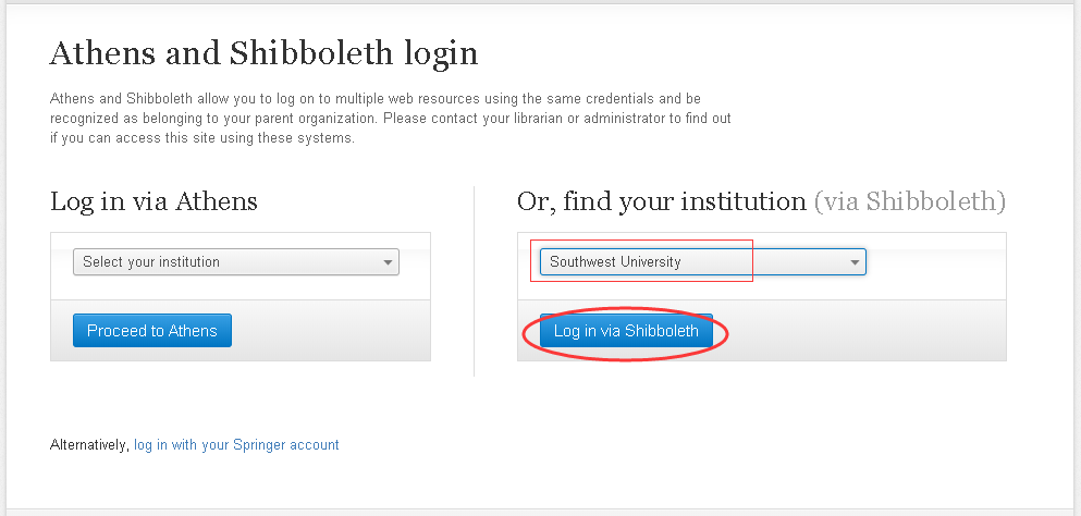 1.使用非校园 IP 地址打开https://link.springer.com/,选择“Log in”,选择“Log in via Shibboleth or Athens”,在Or, find your institution 下面的“Select your institution” 搜索并选择“Southwest University”,点击“Log in via Shibboleth”