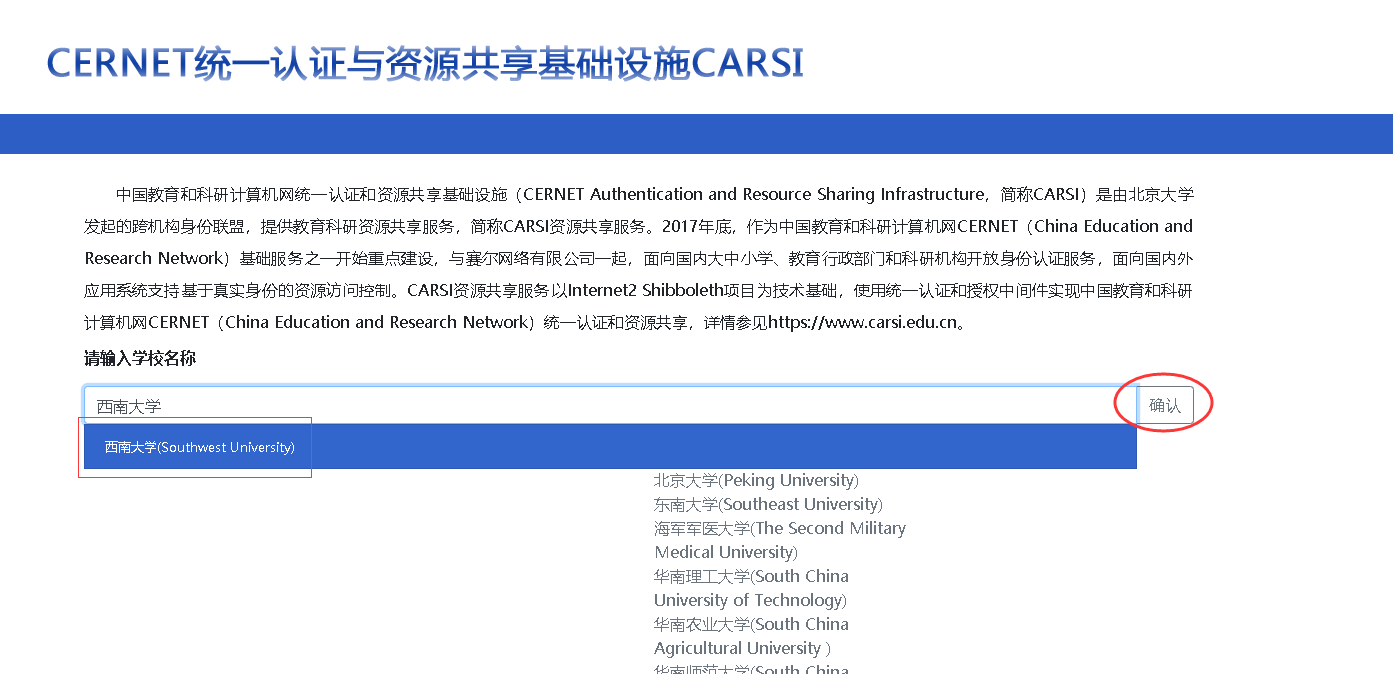 CARSI是中国教育科研网统一认证和资源共享基础设施(CERNET Authentication and Resource Sharing Infrastructure),是由CERNET会员单位北京大学发起的一项跨域认证授权服务,服务对象为已经接入教育网的大中小学、各级教育管理部门和科研机构。它是在已广泛建立的校园网统一身份认证和用户管理系统基础上,建设的一套用户身份和应用系统资源共享机制。