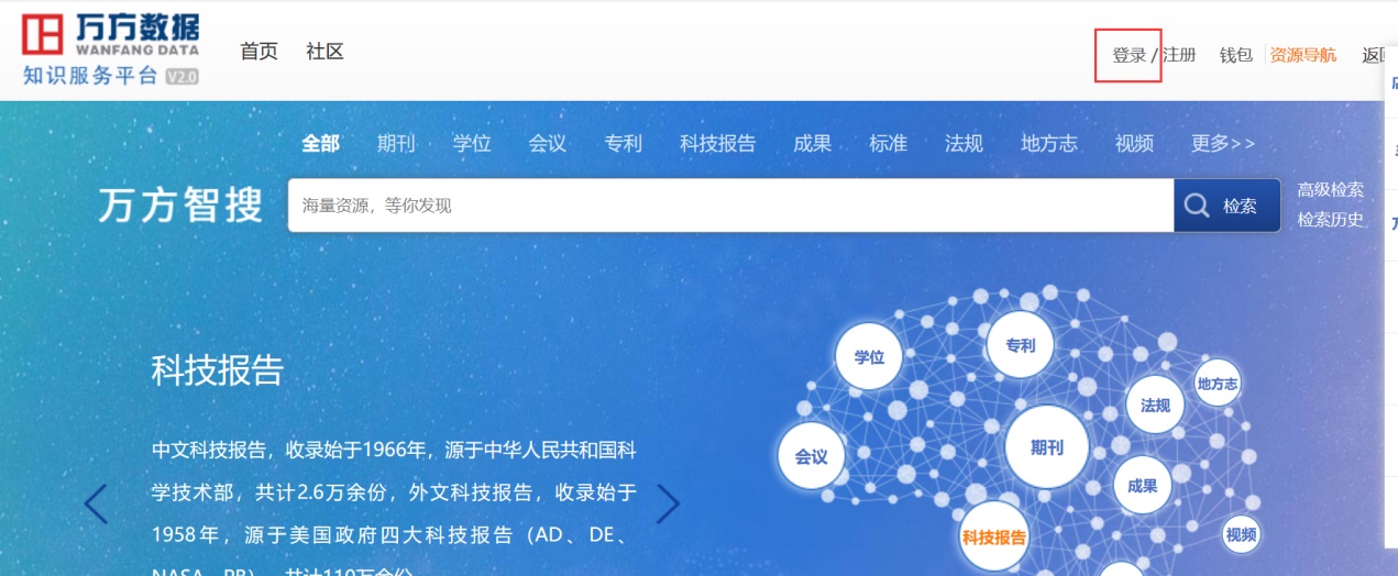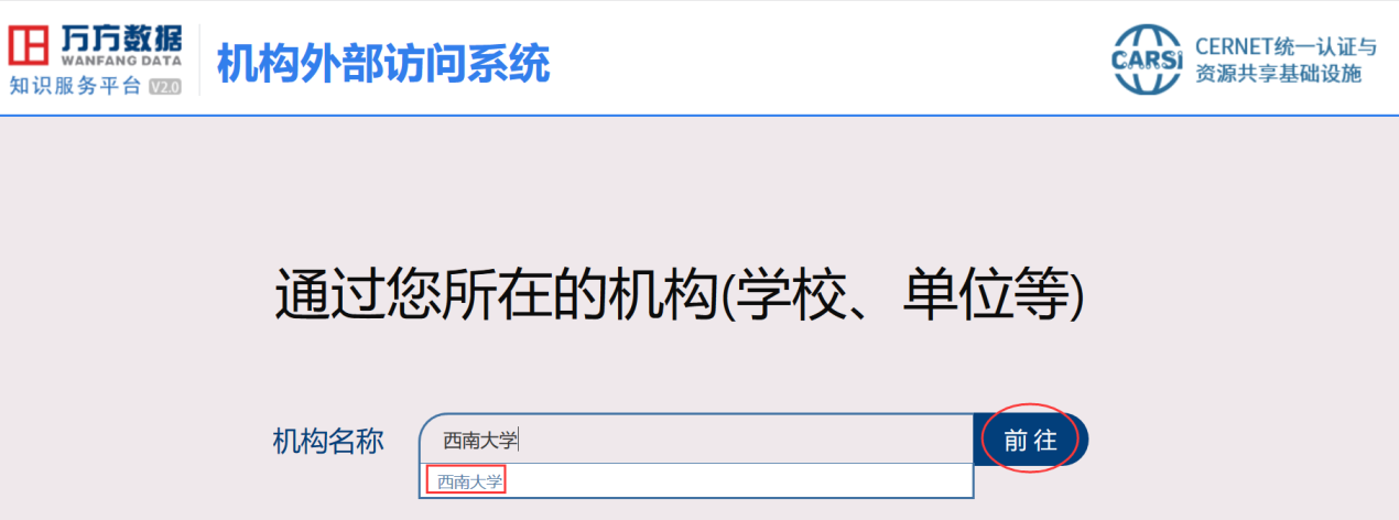 1、使用非校园 IP 地址打开http://www.wanfangdata.com.cn,选“登录”、“CARSI图标”