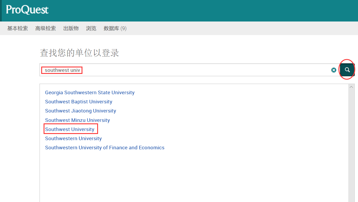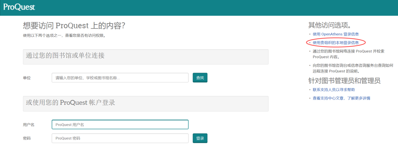 1.使用非校园 IP 地址打开https://search.proquest.com,点击“使用贵组织的本地登录信息”