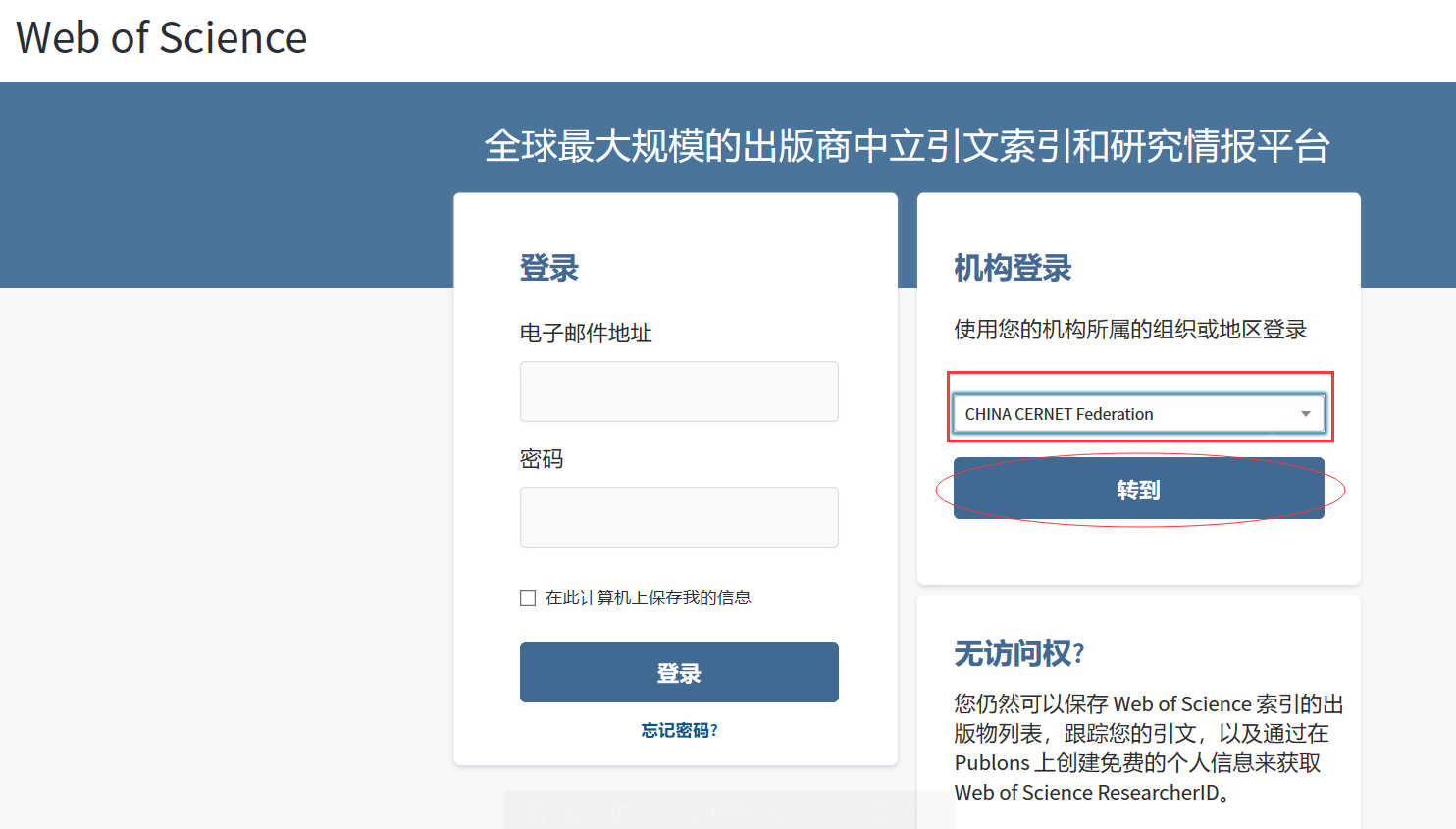 1.使用非校园 IP 地址打开www.webofknowledge.com,在机构登录下,选择机构 “CHINA CERNET Federation”,点击“转到”