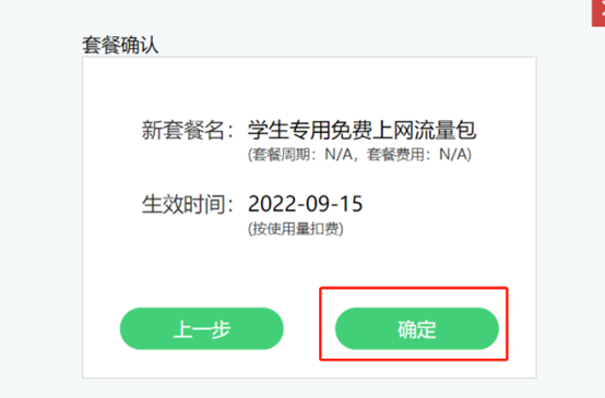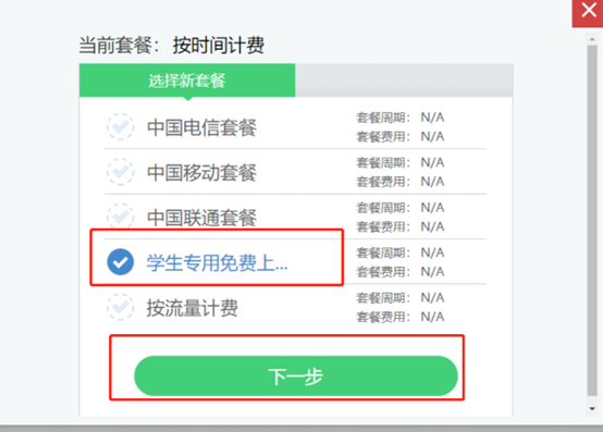 4、选中“学生专用免费上网流量包”,然后点击“下一步”。